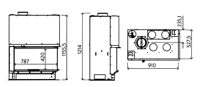 - дымоход смещён от центра к краю для удобства подключения топки к существующим кирпичным дымоходам;