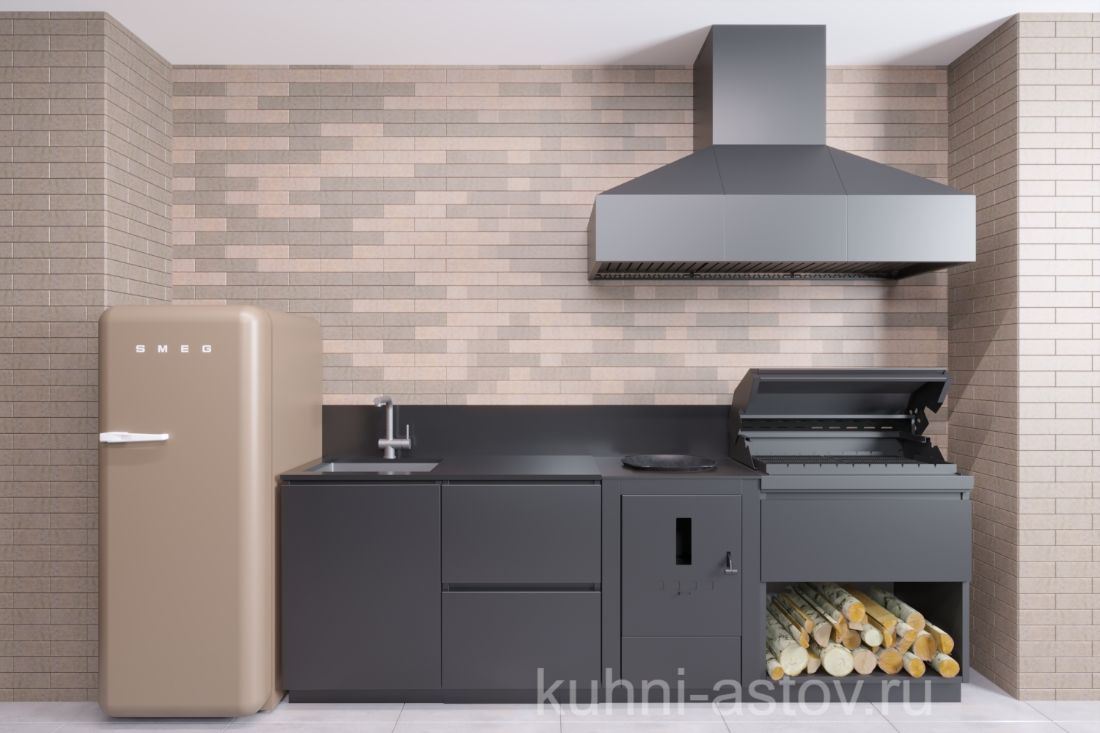 Корпус и фасады выполнены из оцинкованной стали толщиной 1 мм. Фасады двухконтурные с шумоизоляцией. Корпус, фасады, полка, вытяжной зонт покрашены порошковой краской в 2 слоя, цвет: RAL9005. Столешница из натурального камня грант Absolut Black полированный 20 мм. Бортик из натурального камня грант Absolut Black полированный 20 см. Оптимальным решением для организации функционального пространства на свежем воздухе является летняя уличная кухня ASTOV BBQ, имеющая следующие особенности: