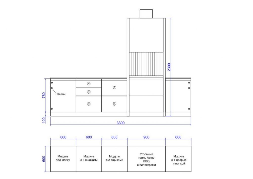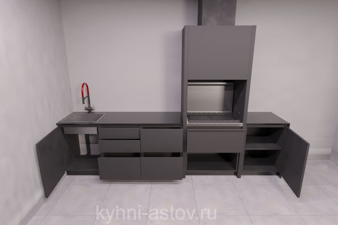 Для идеального сочетания стиля, удобства и долговечности – наша уличная кухня для дачи в предлагаемой конфигурации. Данная модель исполнена из стали с оцинковкой, что гарантирует её устойчивость к коррозии и возможность длительной эксплуатации. Порошковое покрытие RAL9005 придаёт месту готовки суровый и элегантный внешний вид, вписываясь в любую ландшафтную архитектуру. Базовый комплект включает в себя блоки для мойки и хранения (тумбы с выкатными ящиками, распашные и открытые), гриль на угле с зонтом вытяжки, легкосъёмный цоколь на магнитах. По желанию клиента композиция, как и все наши зоны барбекю из металла, может быть расширена включением дополнительных модулей и техники.