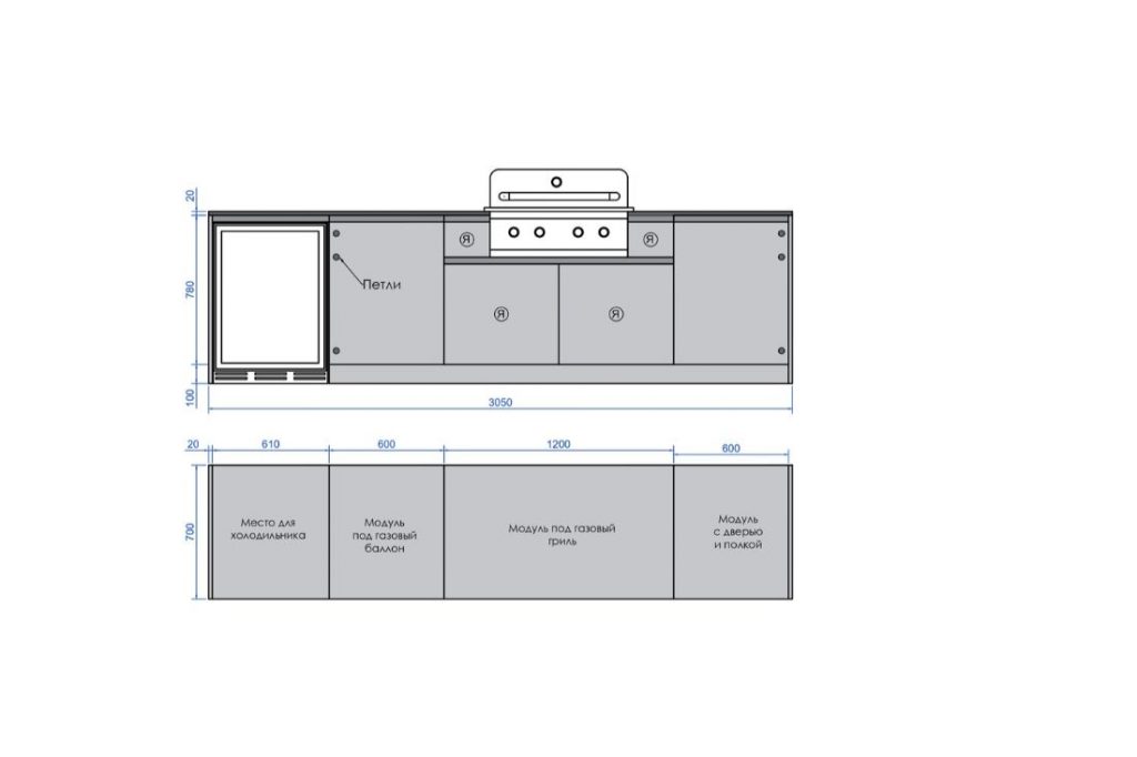 В комплектацию кухни Астов №15 НЕ ВХОДИТ столешница, газовый гриль, газовый баллон, холодильник. Их можно заказать отдельно.