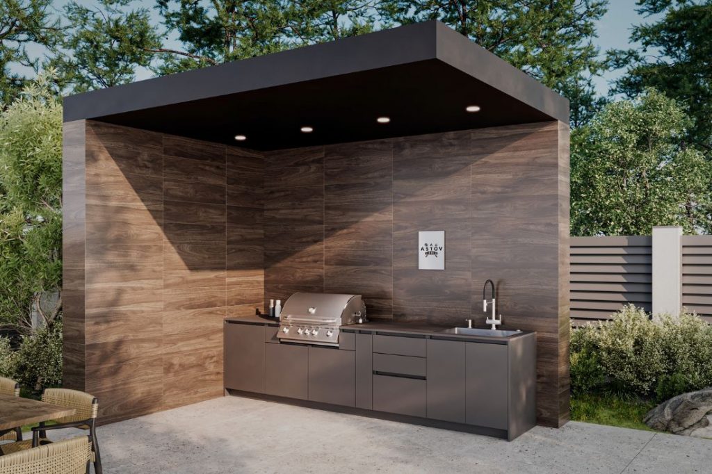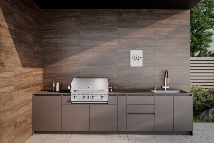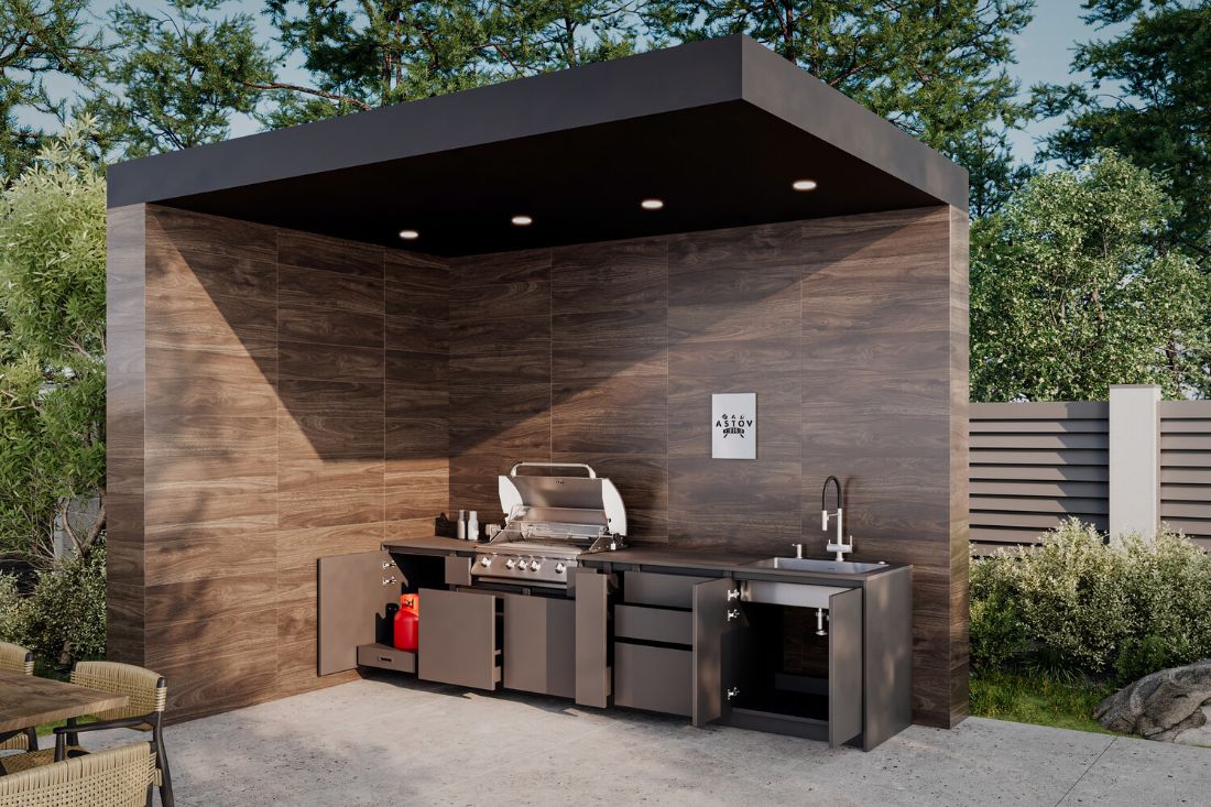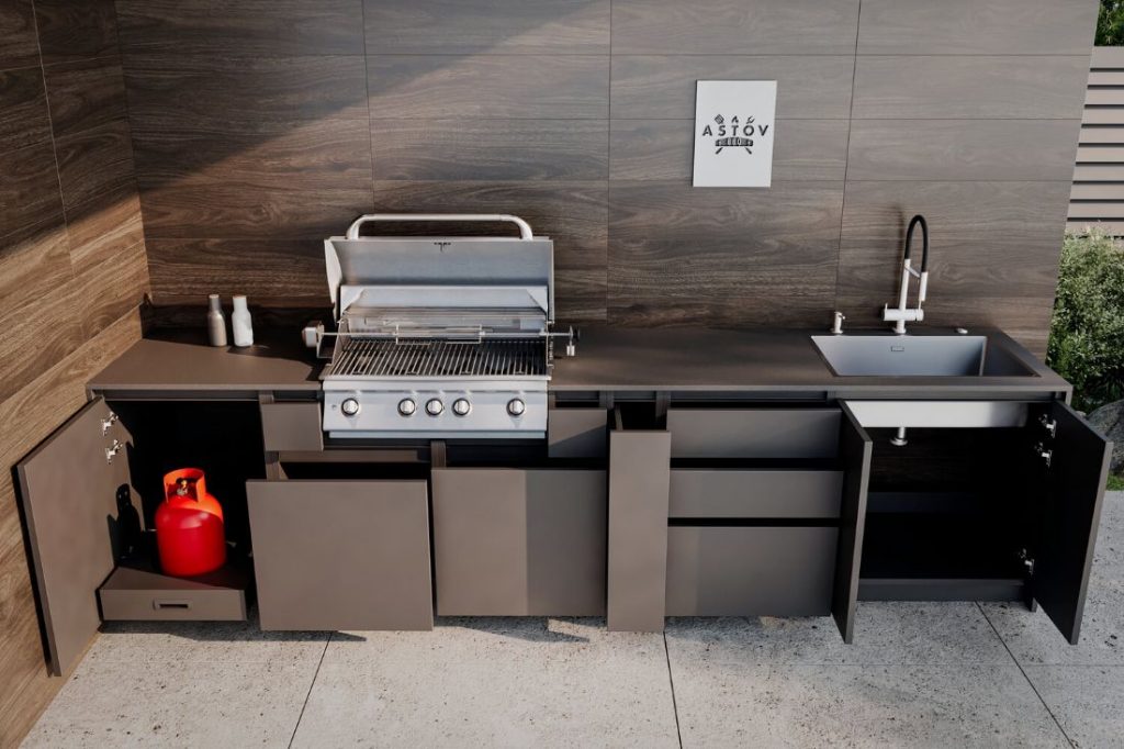 Кухня Astov BBQ для тех, кто любит готовить на газовом гриле и ценит удобство системы хранения. В этой зоне BBQ есть удобный модуль с выдвижной полкой для газового баллона, модуль для гриля с системой хранения, ну и куда же без модуля под мойку и модуля с 3мя ящиками. Долговечность, качество, стильный внешний вид!