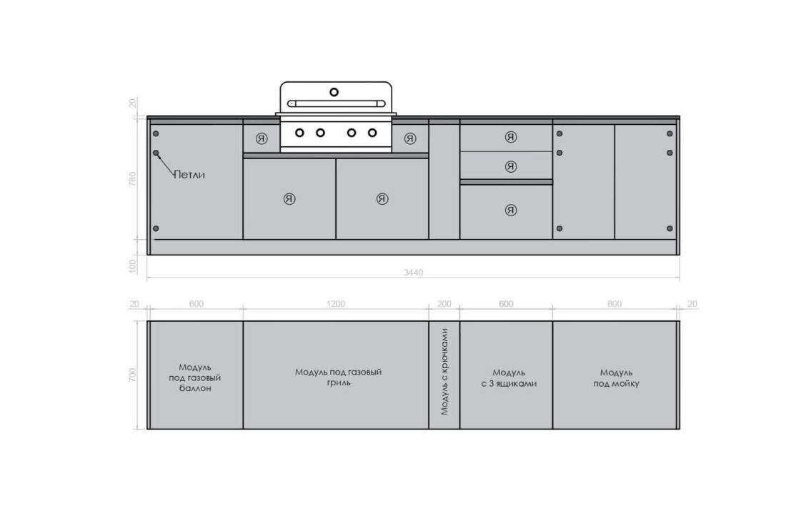 В комплектацию кухни Астов №2 НЕ ВХОДИТ газовый гриль, баллон, столешница, мойка и смеситель. Их можно заказать отдельно.
