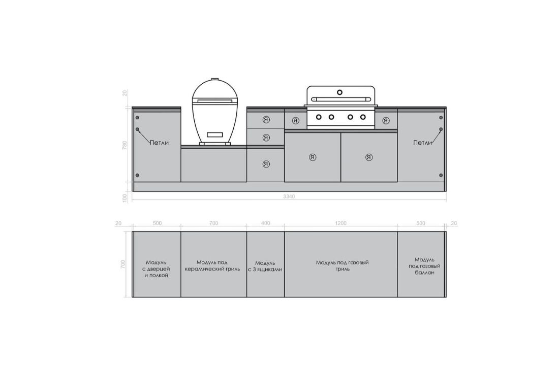В комплектацию кухни Астов №3 НЕ ВХОДИТ газовый гриль, баллон, столешница, керамический гриль. Их можно заказать отдельно.